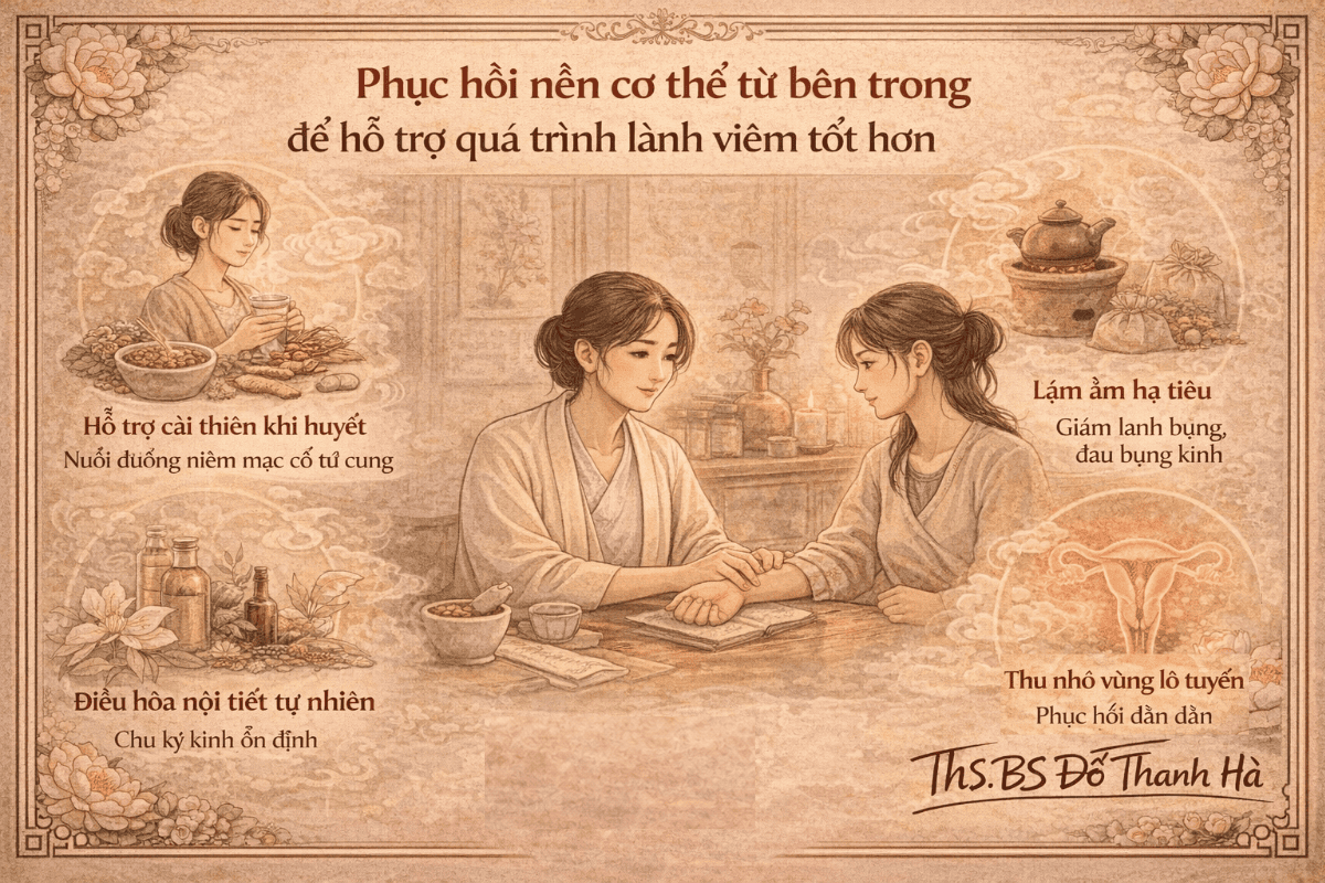 - Hai là nền cơ thể suy, thể hiện qua mạch khí huyết kém, hạ tiêu dễ lạnh, đau bụng kinh nhiều, dễ mệt và khả năng phục hồi chậm. Khi nền thể trạng này kéo dài, niêm mạc cổ tử cung thường mỏng và nhạy cảm hơn, dễ bị tổn thương và khó tự phục hồi nếu chỉ xử lý triệu chứng tại chỗ.